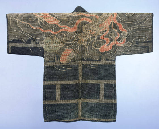 *The aesthetic history of Japan makes nearly everything that has emerged from that culture beautiful and often surprisingly functional, a comb, a dish, a sword, a bit of cloth. At the Metropolitan Museum of Art I attended a show this year on the kimono, an object always guaranteed to take one’s breath away: delicate fabrics and designs on garments that are at once structured and soft, romantic and elegant. There is sometimes a tension between the inside and outside of the garment, for in an exceedingly formal society such as pre-modern Japan, clothes really did make the man, or woman. Some severe or intimidating kimono have linings that tell a different story, just as the inner person is hidden from the eyes of strangers. Only in an intimate setting could one have had the privilege of viewing the exquisite interior of some of these garments. What impressed me most, though, were the firemen’s jackets….heavily padded or quilted garments made of cotton, adorned on the outside with a company designation, and inside with ferocious images of thunder, fire gods, and dragons. They were meant to be soaked in water prior to entering a fire. It was astounding: the firemen were protected by wet cotton, and gods.
